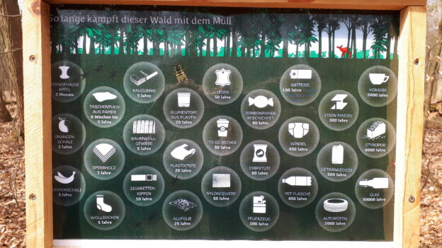 Zum Teil überraschende Zeiten von Materialien bei den man das so nicht erwartet hätte: „angenehme“ Überraschungen u.a. Plastikbeutel & -topf und Alufolie. Oder aber auch wie lange im Vergleich dazu der Pappbecher benötigt; von Glas ganz zu schweigen. Aber auch schon eine vermeintlich harmlose Bananenschale „stört“ drei Jahre.